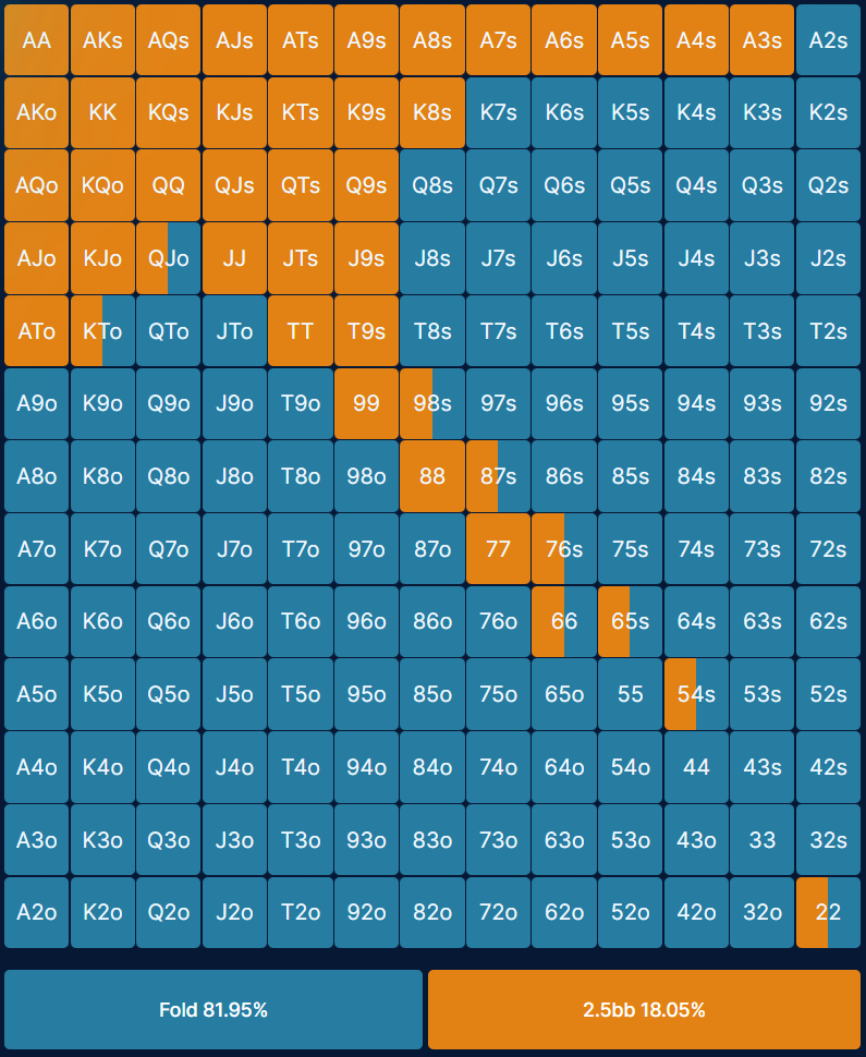 These 6 max preflop ranges are simplified versions of the strategy output by GTO poker solvers. GTO strategy involves a lot of mixing, which means that a particular hand combo may be raised 18% and folded 72%. Each poker hand chart has been simplified so that the frequency of an action for each hand combo is rounded to the nearest 50%. If you see a hand with a mix of colours, it means you should take one action half the time and the other action half the time. You can either use a randomizer (e.g. one action if high card first, other action if small card first) or base you action on your reads of your opponent, e.g. if they play too tight or too loose. This makes it easier to learn a solid base strategy and implement in game, without losing too much accuracy.