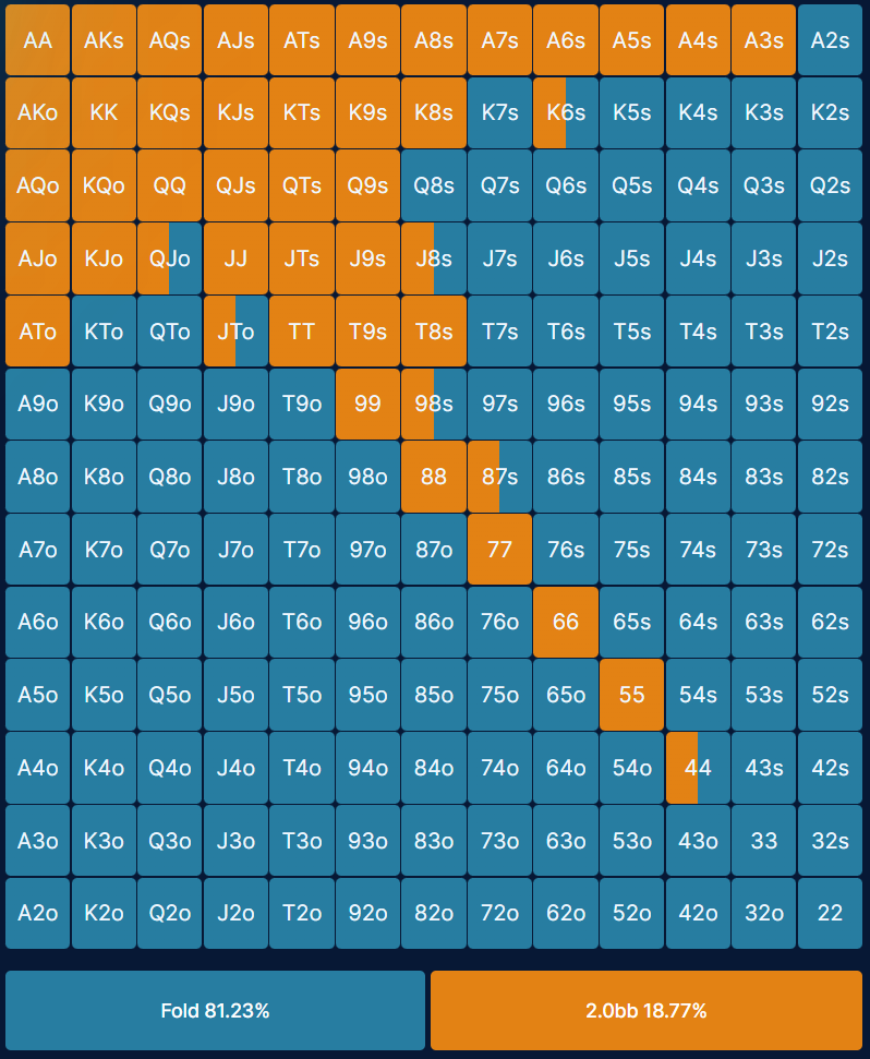 These 6 max preflop ranges are simplified versions of the strategy output by GTO poker solvers. GTO strategy involves a lot of mixing, which means that a particular hand combo may be raised 18% and folded 72%. Each poker hand chart has been simplified so that the frequency of an action for each hand combo is rounded to the nearest 50%. If you see a hand with a mix of colours, it means you should take one action half the time and the other action half the time. You can either use a randomizer (e.g. one action if high card first, other action if small card first) or base you action on your reads of your opponent, e.g. if they play too tight or too loose. This makes it easier to learn a solid base strategy and implement in game, without losing too much accuracy.