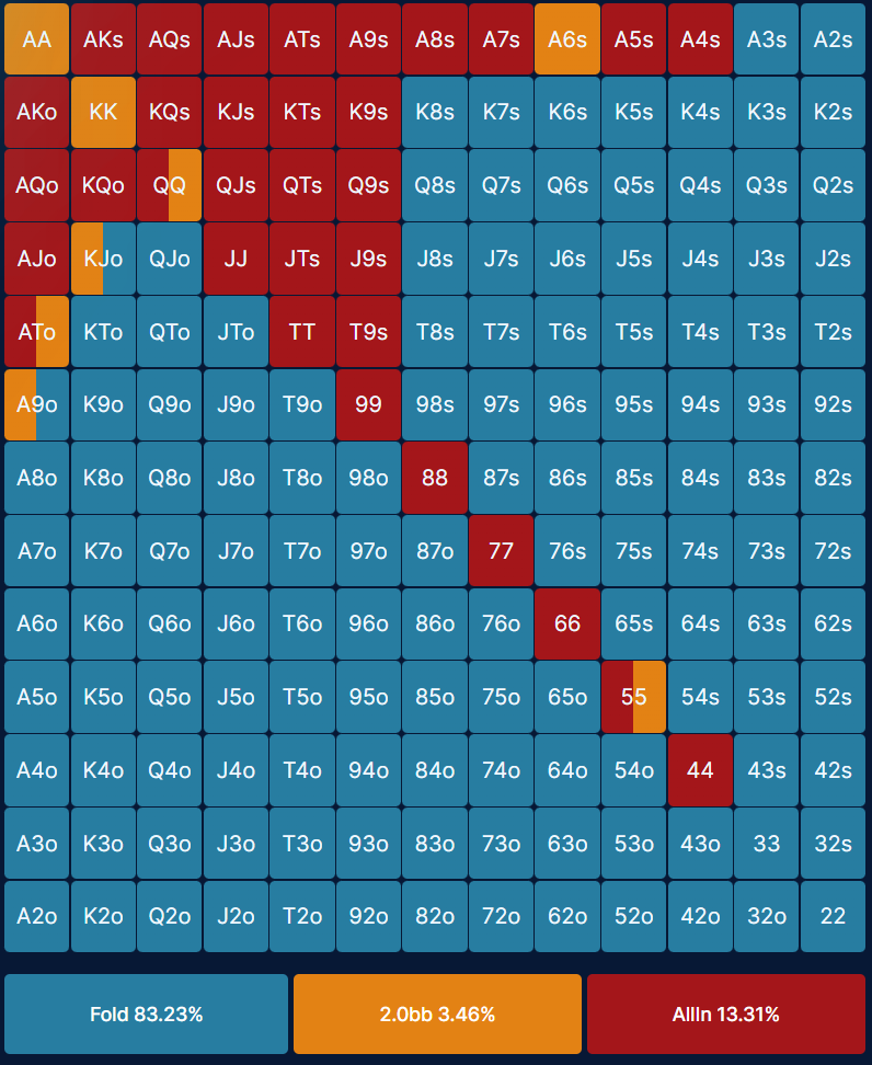 There are also some small RFI min-raises to 2bb at 10bb, but these are less common than the all in RFI and so these preflop charts only show the response to the all in. The online range viewer has all these preflop ranges and more, including solutions with open limps as well as min raise or all in.