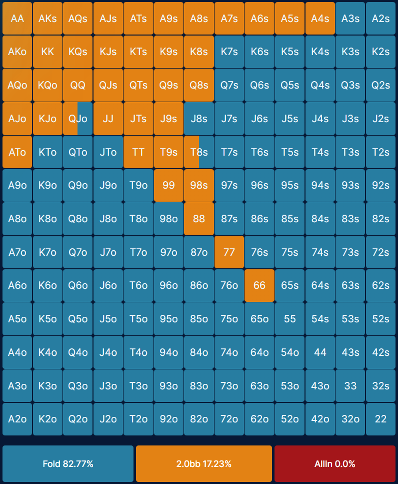 There are also small 3bets at 20bb, but these are less common than the all in 3bet and so these preflop charts only show the response to the all in. The online range viewer has all these preflop ranges and more.