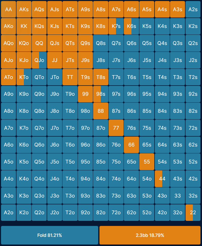 These MTT preflop ranges are simplified versions of the strategy output by GTO poker solvers. GTO strategy involves a lot of mixing, which means that a particular hand combo may be raised 18% and folded 72%. Each poker hand chart has been simplified so that the frequency of an action for each hand combo is rounded to the nearest 50%. If you see a hand with a mix of colours, it means you should take one action half the time and the other action half the time. You can either use a randomizer (e.g. one action if high card first, other action if small card first) or base you action on your reads of your opponent, e.g. if they play too tight or too loose. This makes it easier to learn a solid base strategy and implement in game, without losing too much accuracy.