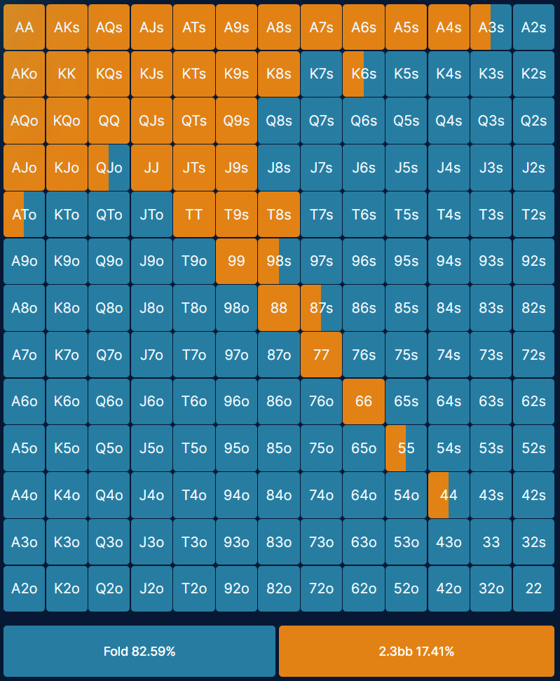 These MTT preflop ranges are simplified versions of the strategy output by GTO poker solvers. GTO strategy involves a lot of mixing, which means that a particular hand combo may be raised 18% and folded 72%. Each poker hand chart has been simplified so that the frequency of an action for each hand combo is rounded to the nearest 50%. If you see a hand with a mix of colours, it means you should take one action half the time and the other action half the time. You can either use a randomizer (e.g. one action if high card first, other action if small card first) or base you action on your reads of your opponent, e.g. if they play too tight or too loose. This makes it easier to learn a solid base strategy and implement in game, without losing too much accuracy.