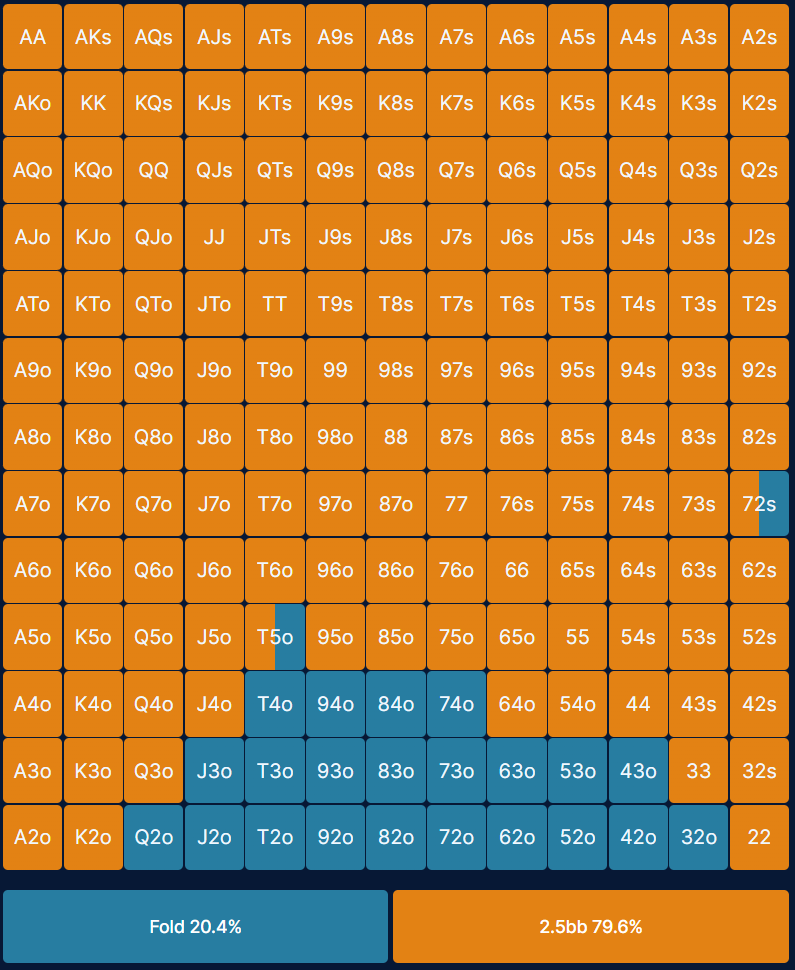These NLHE Heads Up preflop ranges are simplified versions of the strategy output by GTO poker solvers. GTO strategy involves a lot of mixing, which means that a particular hand combo may be raised 18% and folded 72%. Each poker hand chart has been simplified so that the frequency of an action for each hand combo is rounded to the nearest 50%. If you see a hand with a mix of colours, it means you should take one action half the time and the other action half the time. You can either use a randomizer (e.g. one action if high card first, other action if small card first) or base you action on your reads of your opponent, e.g. if they play too tight or too loose. This makes it easier to learn a solid base strategy and implement in game, without losing too much accuracy.
