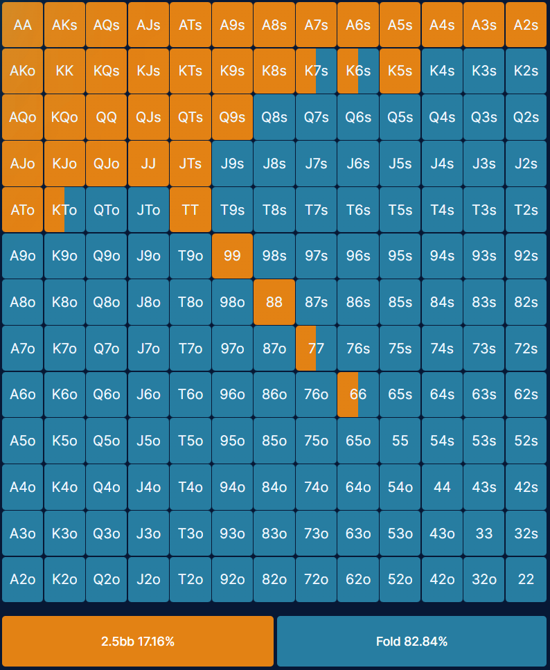 These 6 max preflop ranges are simplified versions of the strategy output by GTO poker solvers. GTO strategy involves a lot of mixing, which means that a particular hand combo may be raised 18% and folded 72%. Each poker hand chart has been simplified so that the frequency of an action for each hand combo is rounded to the nearest 50%. If you see a hand with a mix of colours, it means you should take one action half the time and the other action half the time. You can either use a randomizer (e.g. one action if high card first, other action if small card first) or base you action on your reads of your opponent, e.g. if they play too tight or too loose. This makes it easier to learn a solid base strategy and implement in game, without losing too much accuracy.