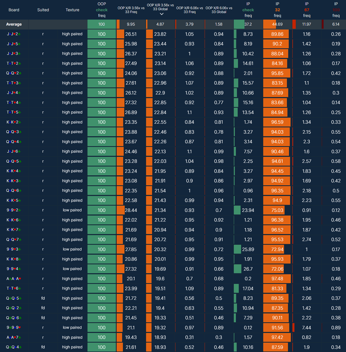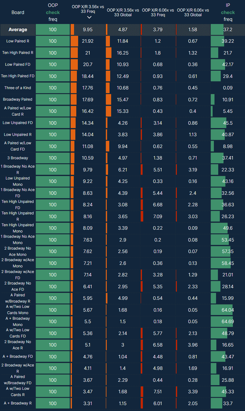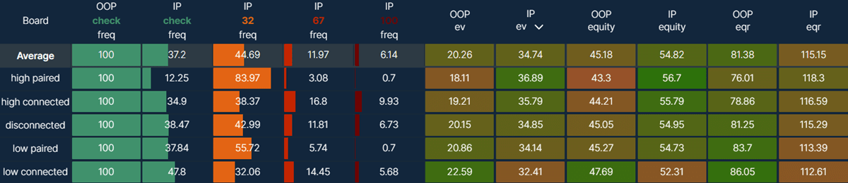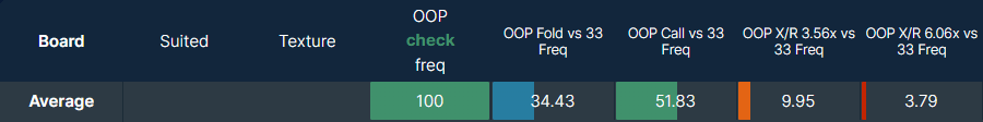 To finish off, we would repeat the process for key OOP strategy stats. At this point, you should have a solid overview of IP betting frequencies and sizings and expected OOP responses on different flop types.