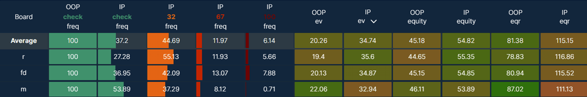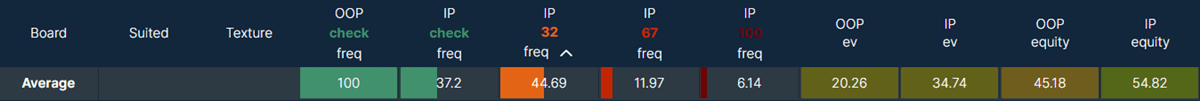We can see that on average, BTN has a big EV and equity advantage. This results in a low average checking frequency for BTN at only 37%, and a cbet frequency of 63%. The most common size for the continuation bet is 1/3 pot, but a larger bet is sometimes chosen on certain flops.