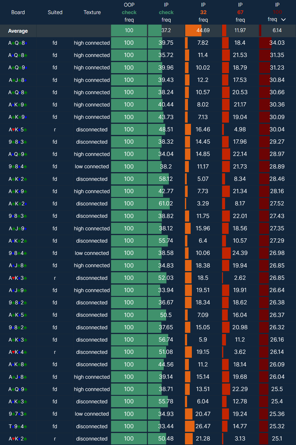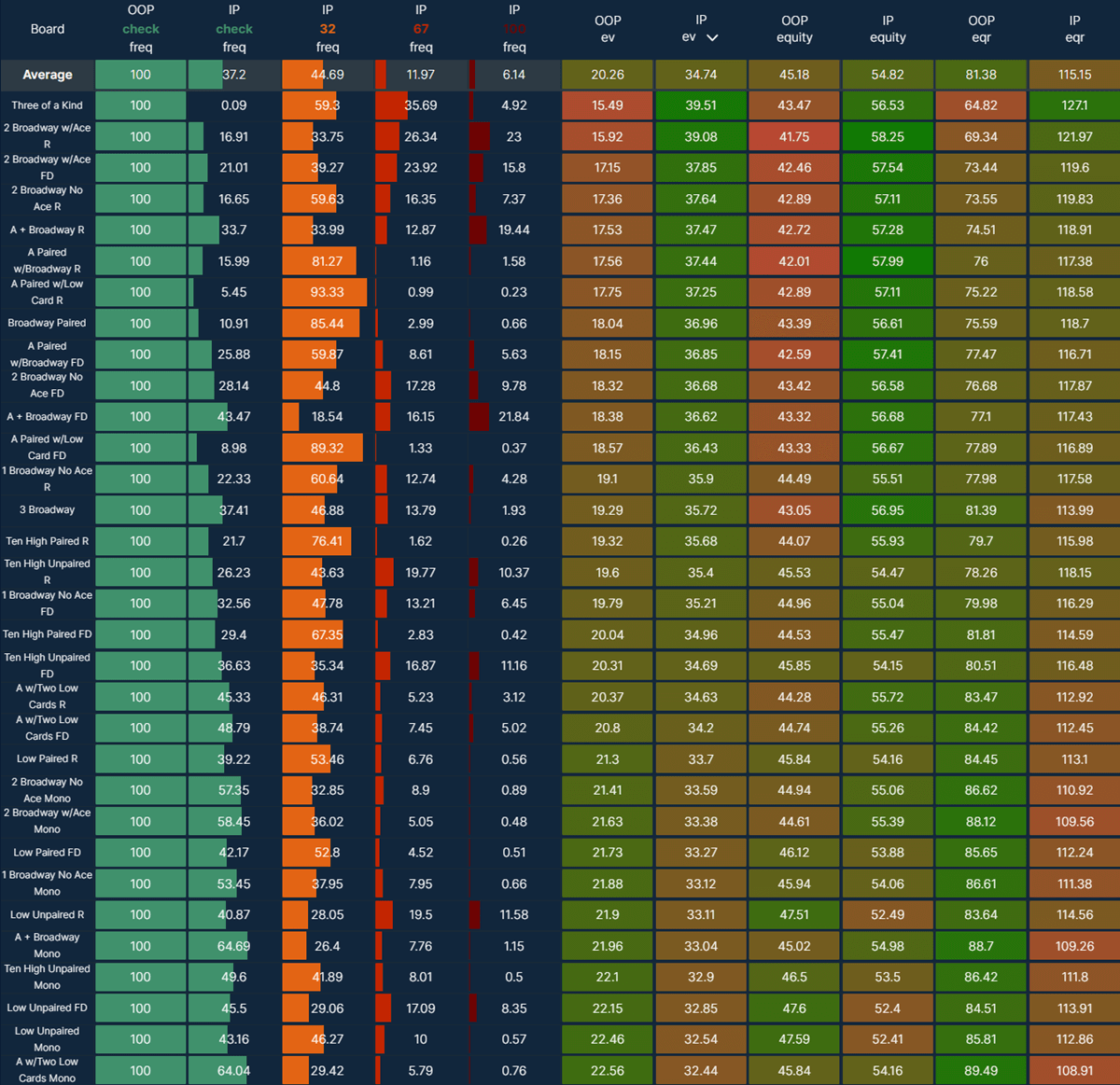 - Look at which flops are best for IP, which are best for OOP - sort the table by EV and EQ.