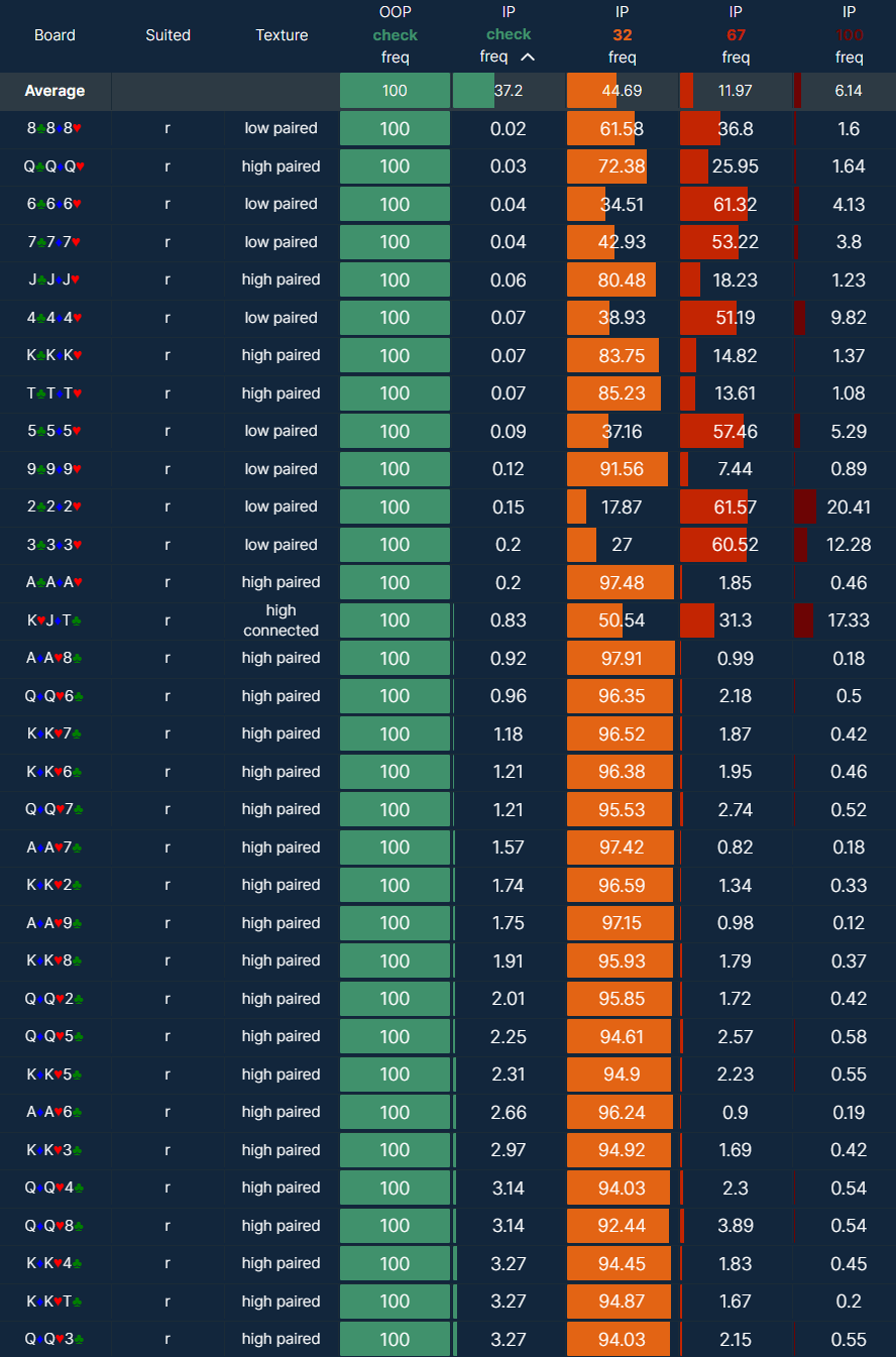 - Despite this, the BTN (in position) still bets at a high frequency, especially on higher paired boards (TTx+).