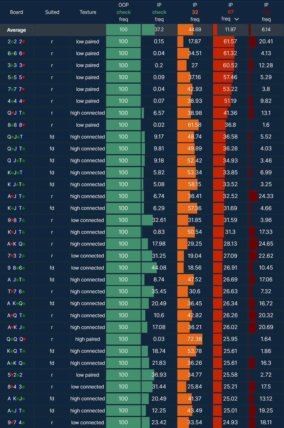 - Low card flops are better for the BB (out of position) due to their wider range of lower suited connectors and low suited 1 and 2 gappers. However, the BTN still has a solid EV advantage and cbets at a moderate frequency (40-60% on average) on these boards.