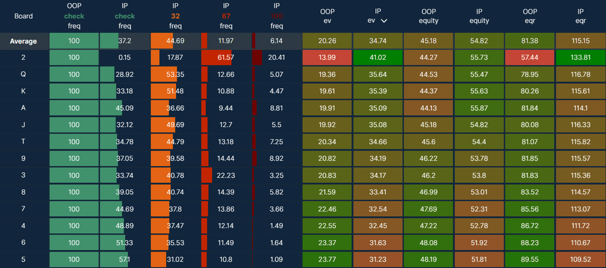 - Low flops are best for OOP due to the BB having more lower suited connectors and low suited 1 and 2 gappers, but IP still has a solid EV advantage and cbets at 40-60% frequency on average on these boards.