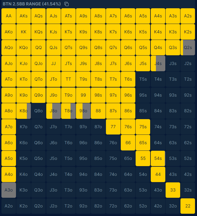 - BTN opening range is uncapped and contains all the best hands, pairs, broadways, suited Aces, Kings, Queens, Jacks, and most suited connectors.
