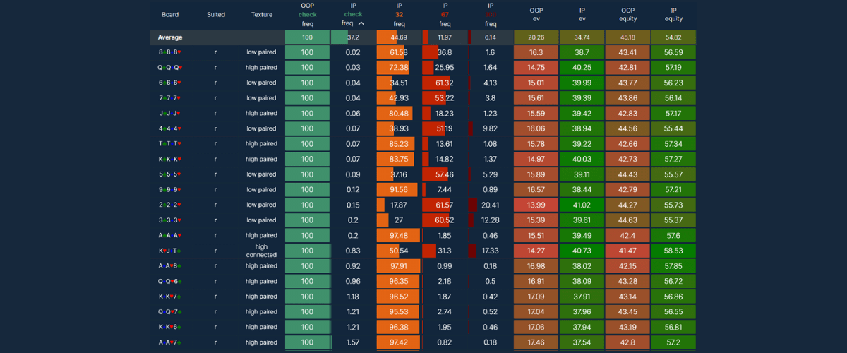 4. Look at which flops are best for IP, which are best for OOP - sort the table by EV and EQ.