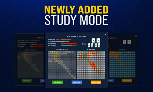 With the study mode on, the strategy review panel will pop up automatically after a large mixing error or a blunder. This way you can instantly review your decision, learn what went wrong and what the strategy should look like. With the study mode you can train poker like a pro!