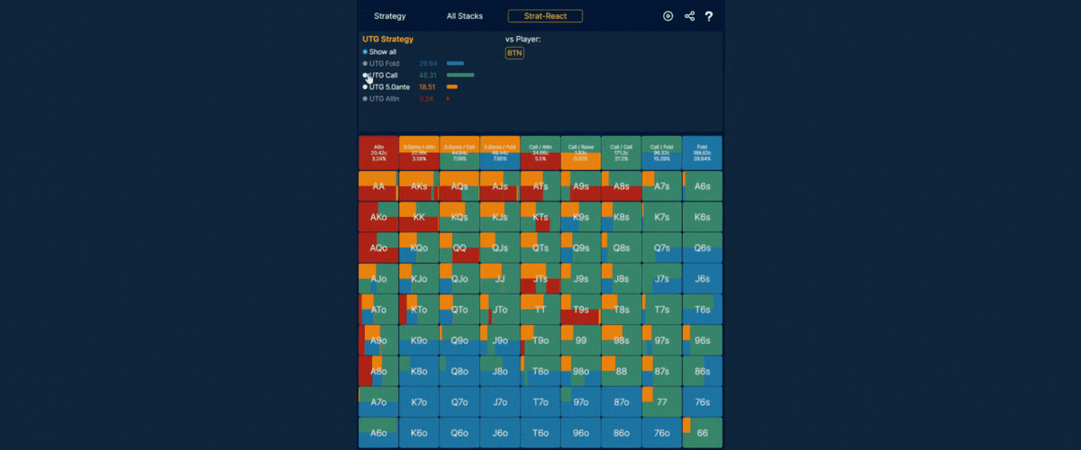 Strategy react feature allows you to see how certain hand combos react to your opponent’s actions. It is available for both preflop and postflop. Choose a player and action you are interested in and then hover over the strategy charts to look up the reaction frequencies. Default view shows the strategy-react for all hero actions at once, but you can select a specific hero action and villain bet or raise size to see the strategy-react for that line only. This is particularly useful when there are multiple bet sizes available. This way you can simplify the display and see how the reaction changes vs a small bet, a large bet, or vs an all in, for example.