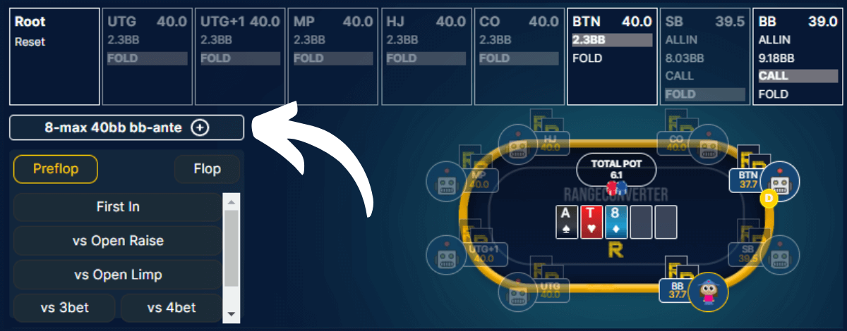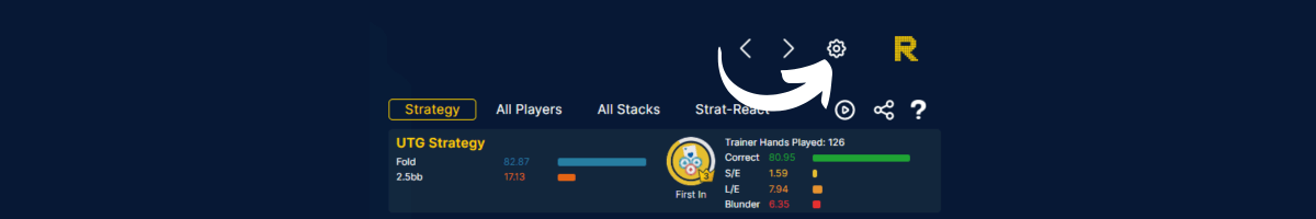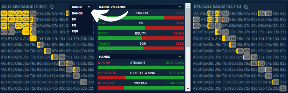 Use the dropdown menus to switch between range versus range view and the active player’s strategy breakdown.
