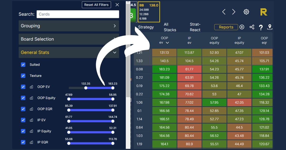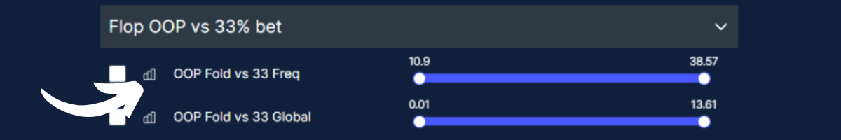You can use multiple sliders and filters together to build compound queries, giving a powerful tool to discover macro strategy insights. e.g. - to find out the highest IP check back flops where OOP cbets below a certain value, move the OOP cbet slider to the left, then sort the table by IP cbet.