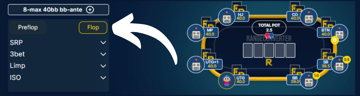 Use the Flop tab to navigate to common postflop spots from the flop onwards. Select the spot type, e.g. SRP, 3bet, limp or iso, and then the specific spot from the list. Next, choose a flop to view the postflop strategy and navigate further through the hand.