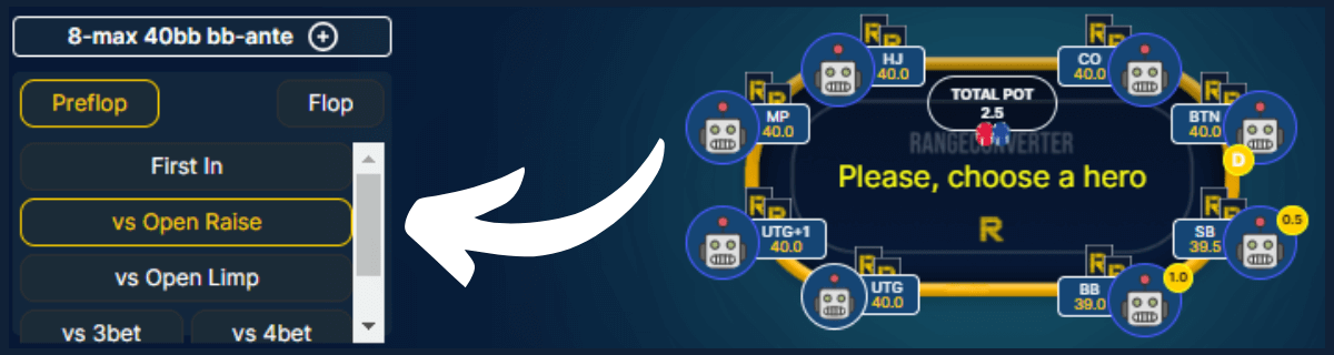 You can also use the preflop quick select menu to navigate to common preflop spots. Select the spot type, hero and villain positions to load the strategy charts and preflop ranges of the active players in the hand.