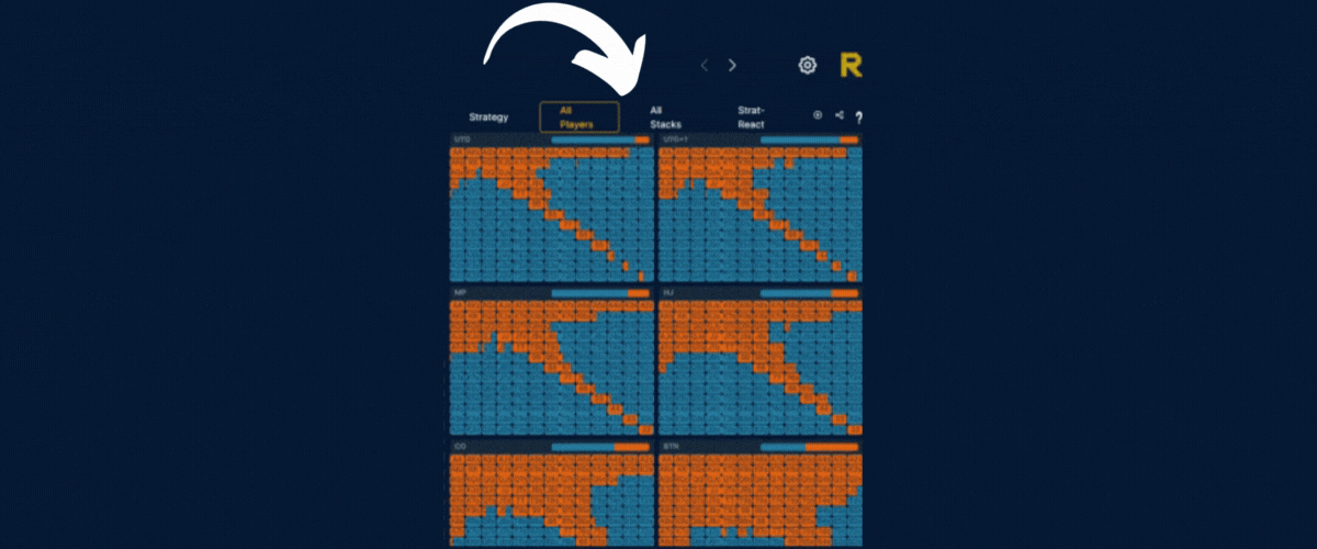 All stacks All stacks tab shows you what your strategy should be at every stack size when facing your poker opponents’ actions. With this feature you can easily learn how stack size changes poker strategy. You can see it all in one place and in one click.