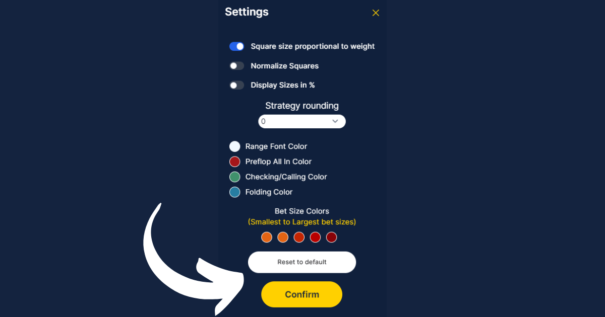- customize all the colors used in the range viewer: check/call and betting actions colors, bet sizes as well as the range text displayed in the charts.