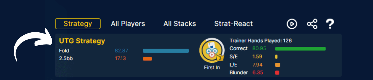 If you want to look up the opening preflop ranges, you can choose the RFI player by clicking any seat at the table or by clicking the strategy bars (all player strategy graph) visible below the table.