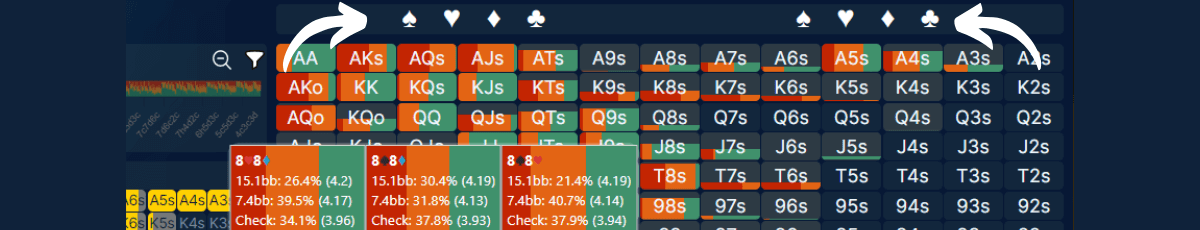 Additionally, while browsing postflop you can filter the strategy chart display to show the strategy only for the specific hand combos, depending on the suits they contain.