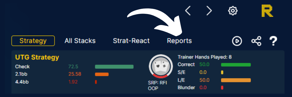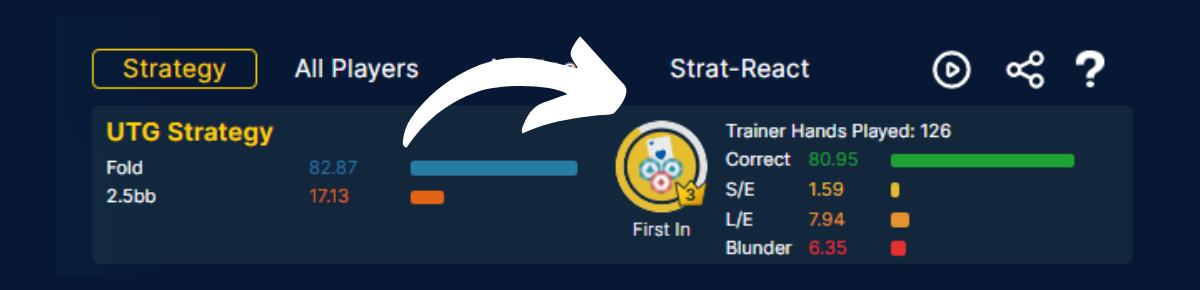 See your GTO training performance for the corresponding spot and specific poker skill. This feature helps you identify potential weak areas in your game, improve your poker skills and track your progress as you study.