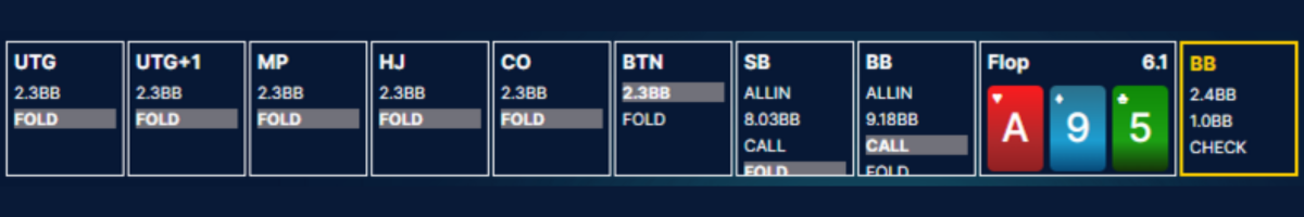 Here you can see a comparison of the range composition for players in the pot, and a breakdown of strategy by hand type for the next player to act.