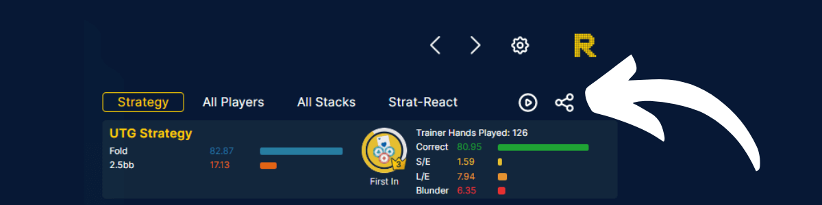 Share the poker hands you are analyzingYou can share the spots you are analyzing with your friends, your poker coach or a team. To do that just press the share icon located above the main strategy chart.