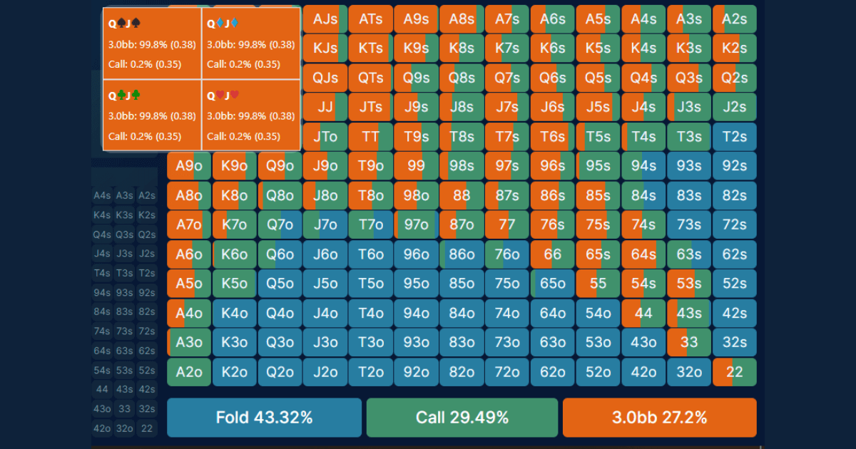 By looking at the strategy chart you can find out which poker hands to play and which to fold. Hover over any combo in the grid to see its breakdown: the actions, frequency and EV for every possible hand combo.