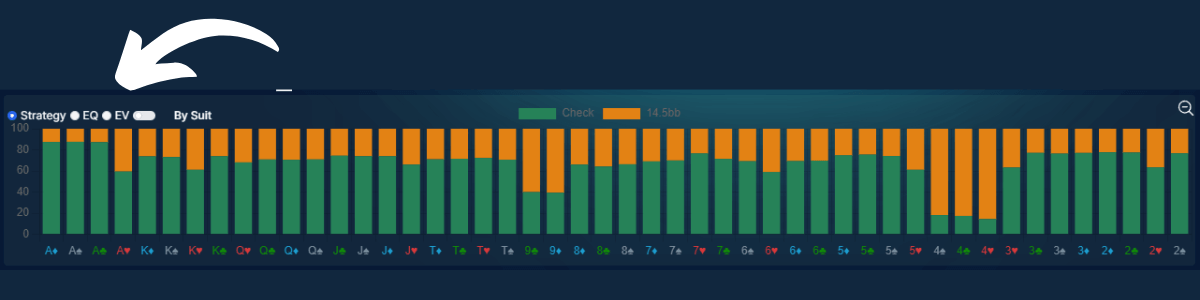 On turn and river the histogram becomes a poker heat map. It can display strategies, EV or EQ values and it can also be filtered by suit. The heatmap gives you a quick visual overview of action frequencies across all the possible turns or rivers, depending on the current street of action.
