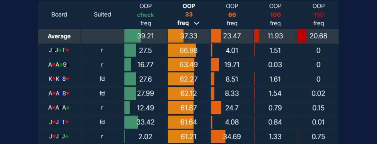 Hover over a bar to see the exact values, and click to load the strategy for that specific flop in the viewer for more detailed analysis.