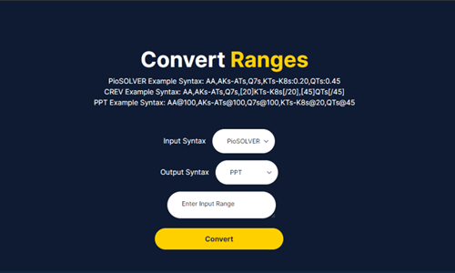 We're pleased to announce that our eponymous range conversion function has now returned to the website! This tool quickly converts ranges into different types of syntax (PioSOLVER, CREV, PPT) - handy for those regularly moving between programs.