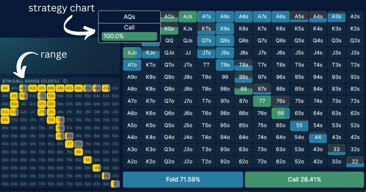 Ranges tell you the percentage of poker hand combos you have at that part of the game tree, whilst strategy charts tell you at what frequency you should take an action.
