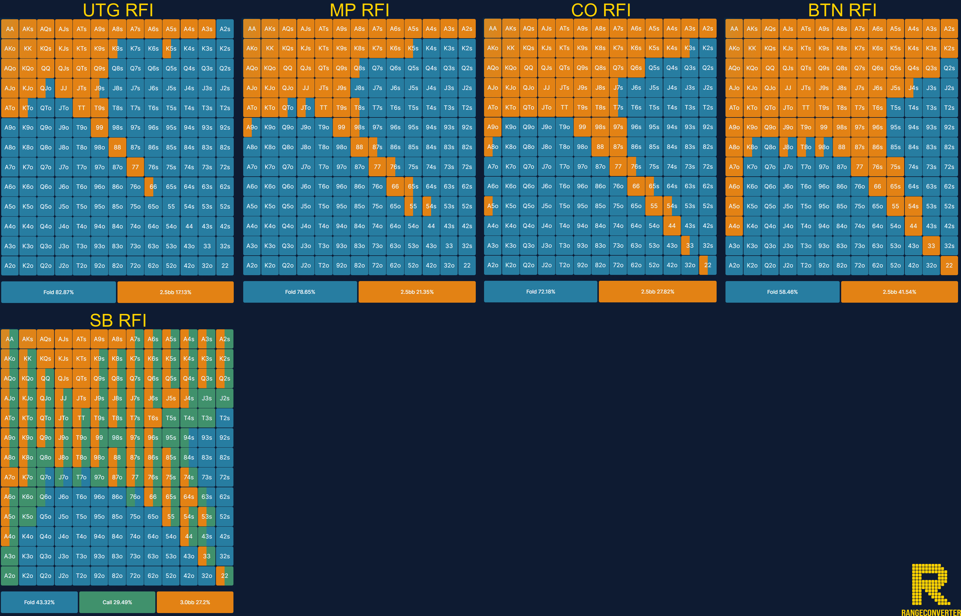 GTO strategy produced by poker solvers involves a lot of mixing, which means that a particular hand combo may take one action some % of the time, and take another action some other % of the time. For example, raise 80% and fold 20%. The preflop charts in the list below have action frequencies rounded to 50% as that is a good compromise to simplify the ranges enough to remember more easily, without sacrificing too much EV.